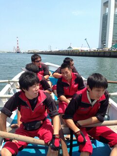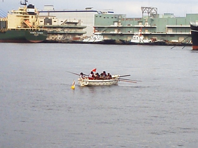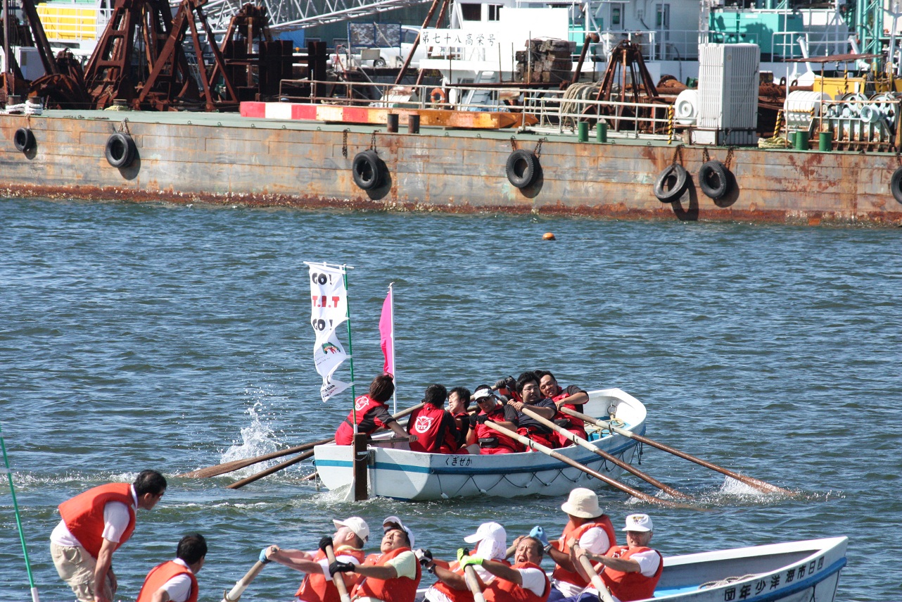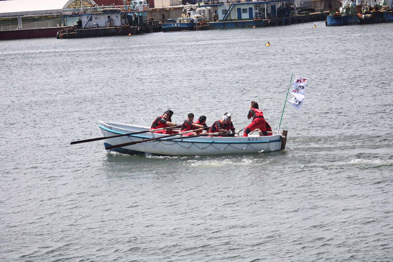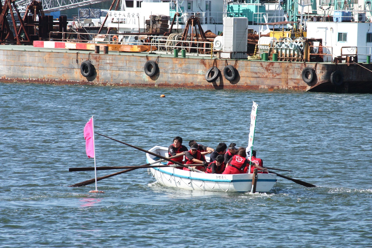 回頭明け、艇長より「声出して~!」と檄が飛ぶ。あ、集中していて忘れていた。その後は声も櫂も力の限り振り絞る。そしてゴールブイを過ぎ横を振り向くと、櫂立てをしているチャレンジ櫂が見えた。