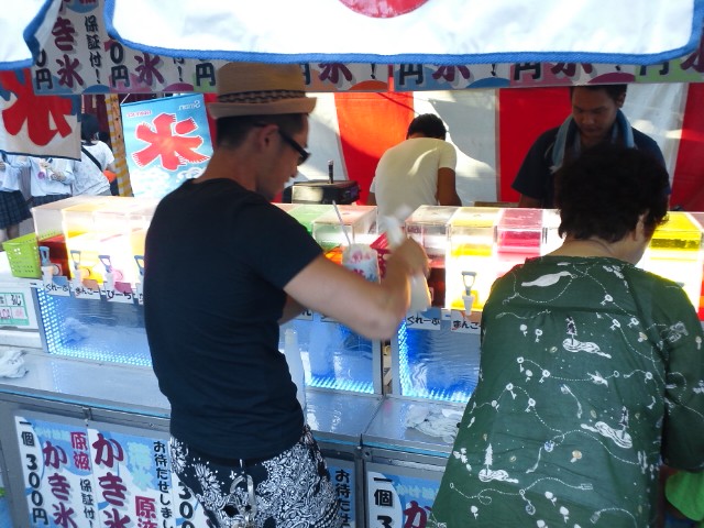 祈りながらくじを引くキャップと、「早くひけよ」と言いたげな係りの人。
