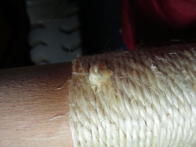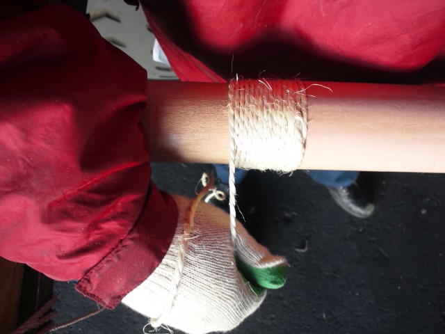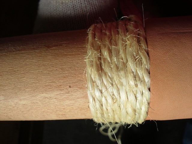 そこで、元々ついている皮のきせ巻きの前後に、麻紐で追加のきせ巻きを巻いて保護しようという寸法な訳です。