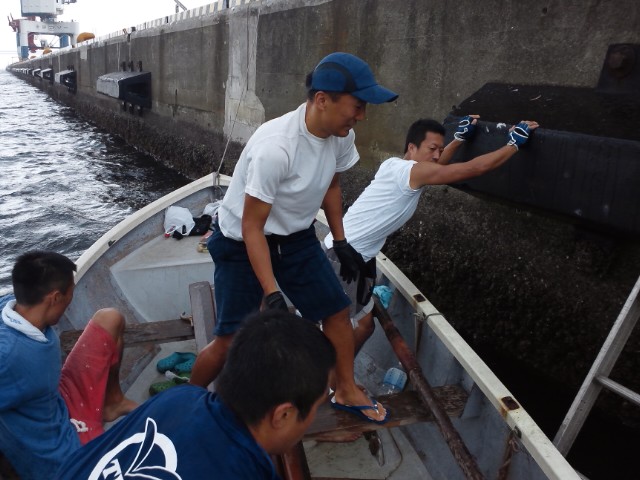 強め風に流されるので、対岸のバナナ倉庫下にもやいを取って、簡易係留。