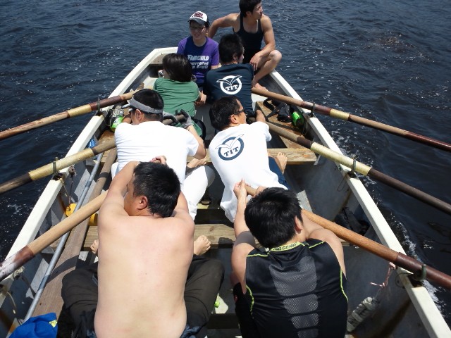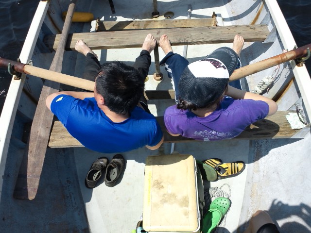 漕がせたい艇長とスズキが、どんどん沖へと誘導する。待ってくれ!そんなに漕いだら、疲れちゃうよ!!って事で足早にスタート地点に移動。