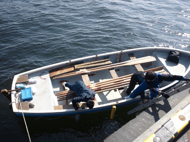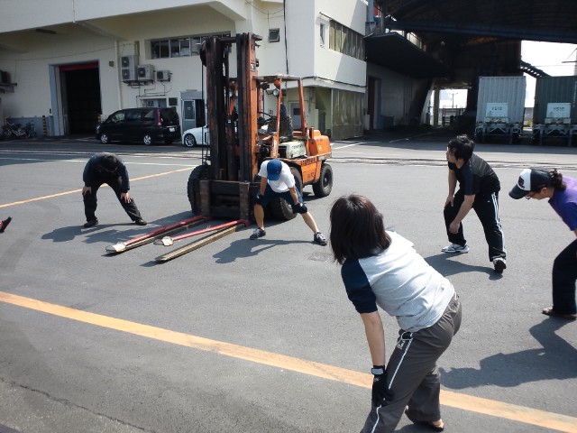 世間はGWで帰省だ行楽だって時に、岸壁で輪になって体操をする9名。