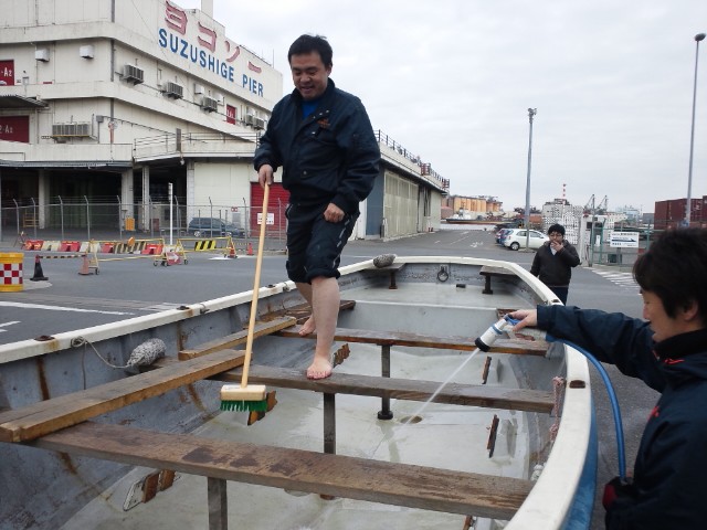 寒風の中はだしで艇をこする1番と、ジェット水流を容赦なく吹き付ける